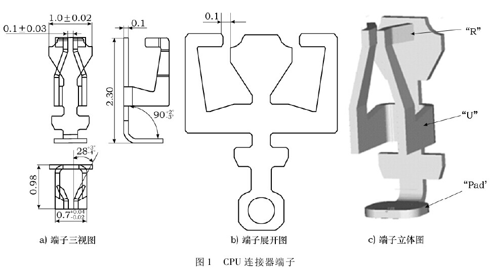 CPU連接器端子,材料為磷青銅(C7025 TM03),厚度為0.1mm,產量需求為每天6000萬件。零件主要技術要求勻”形寬度為0.7mm(見圖1a),正位度;"R”形角度為28;"Pad”形角度為90,沖裁最小間距為0.1mm(見圖1b)。